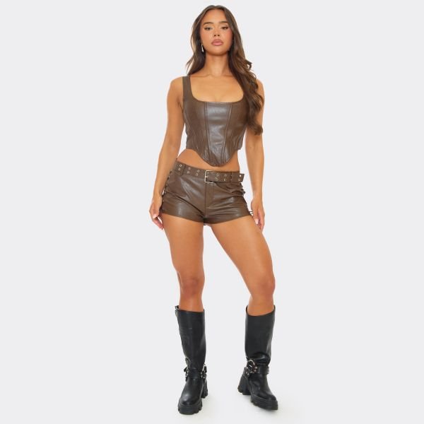 The EGO Edgy Belted Lace-Up Faux Leather Shorts in Brown is available in sizes C16.