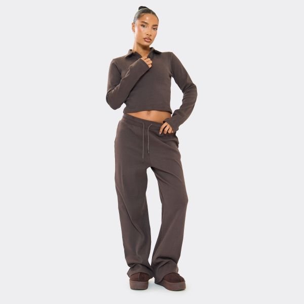 Effortless comfort meets modern tailoring in the chocolate brown, ribbed fabric, mid-rise drawstring waist, wide-leg silhouette trousers. Designed to make travel days stylish, these trousers are ideal for comfy airport outfits.