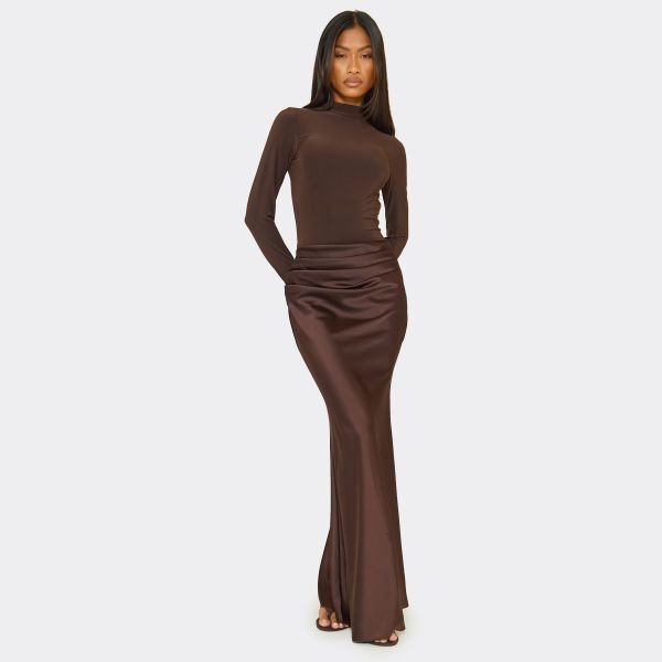 The EGO Elegant Chocolate Brown Satin Maxi Skirt with Ruched Front is ideal for date-night, evening.