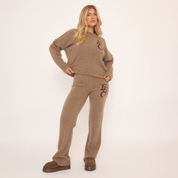 Keep it chill in our Mid Waist EGO Graphic Straight Leg Trousers in Mocha Knit. These brown knit trousers blend comfort and style with a mid-waist fit, luxe EGO graphic and rich mocha knit. Style these straight leg trousers with the matching jumper for a luxe lounging look!