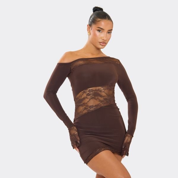 The EGO Off-The-Shoulder Lace Mini Bodycon Dress in Chocolate Brown is ideal for evening, party, date-night.