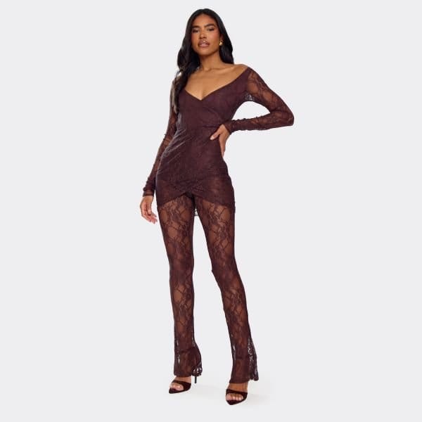 Clock any evening wear dress code with this chocolate brown lace jumpsuit. Effortlessly elegant, it features an off-the-shoulder neckline and a plunging wrap front that adds sophistication to any night-out look. Made from delicate lace with a tailored fit, this jumpsuit hugs your waist and skims your shoulders for a figure-flattering silhouette.