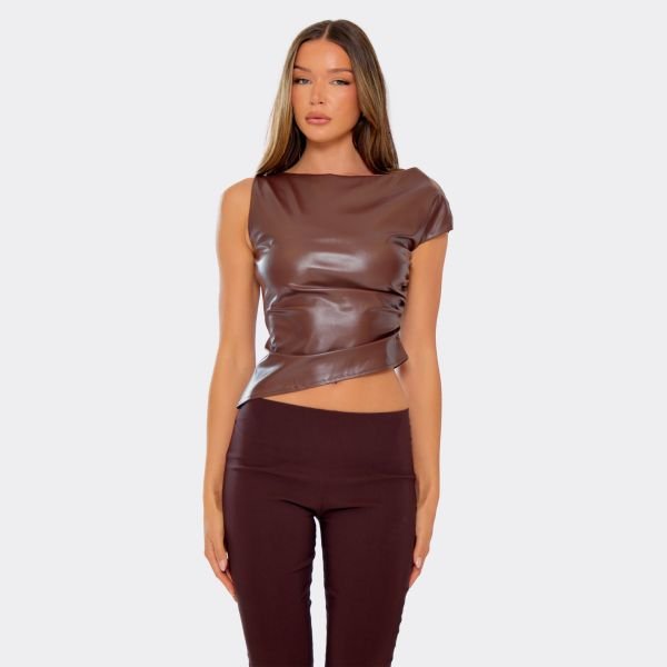 Designed with chocolate brown faux leather, this one-shoulder top features ruched detailing and an asymmetric hemline. The tight, cropped fit hugs your curves perfectly for a sleek and sexy look.