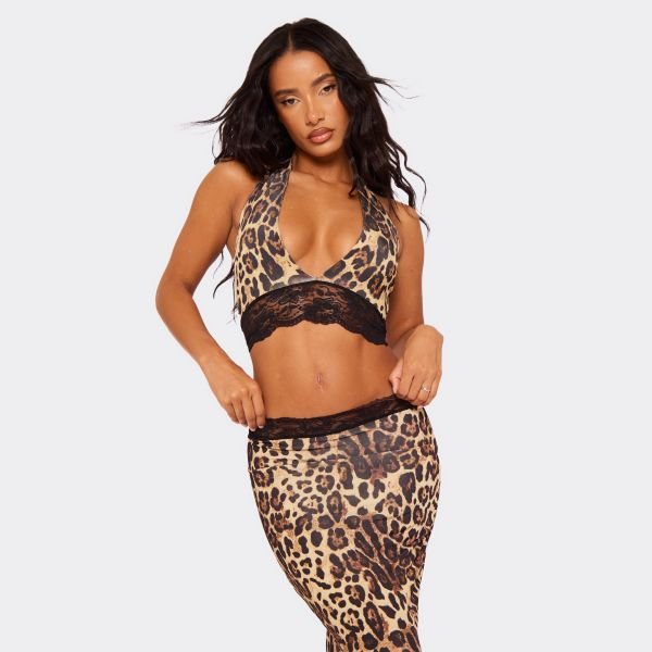 Channeling wild vibes, this brown leopard print top boasts a plunge halterneck and contrast lace hem detailing. Perfect for fierce, flirty looks.