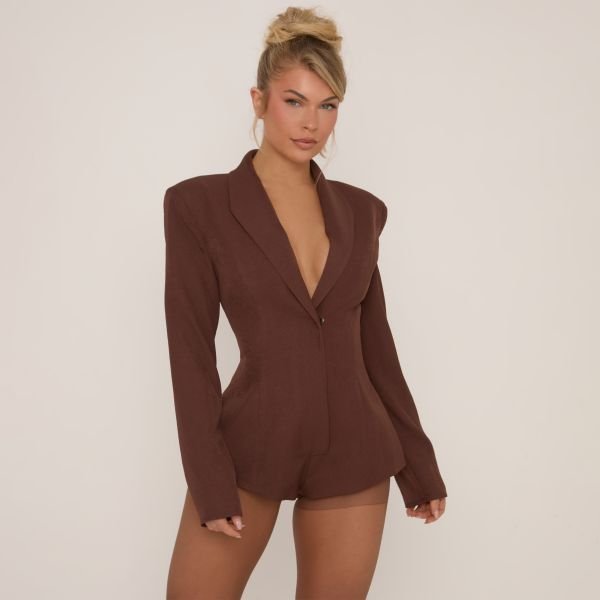 The EGO Plunge Neck Shoulder Pad Detail Tailored Playsuit in Brown is ideal for night out, special event.