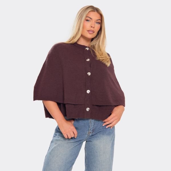 Brown Knit Cape Top — the quintessential piece for chilly-weather dressing. This chic round-neck cardigan features a button-up front and a dramatic cape back detail. Made from soft, warm chocolate-brown knit fabric, it adds an elegant touch to your winter wardrobe. Perfect for layering over a sweater or a shirt, this versatile top is ideal for casual or semi-formal settings.