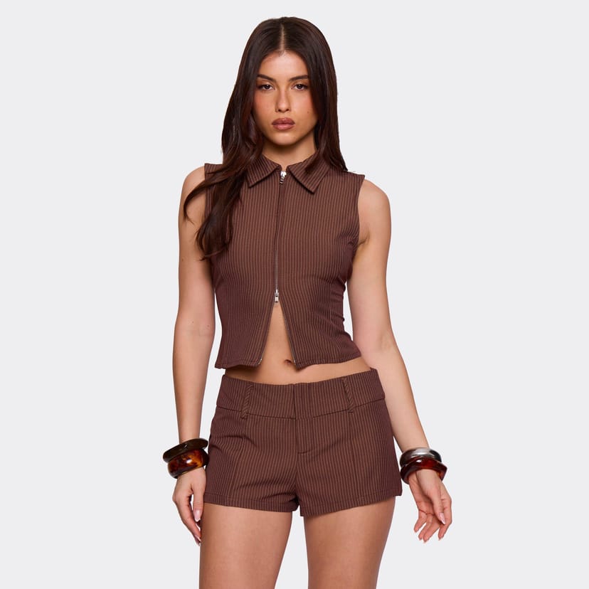 The EGO Brown Pinstripe Sleeveless Zip-Up Top is ideal for casual, daytime.