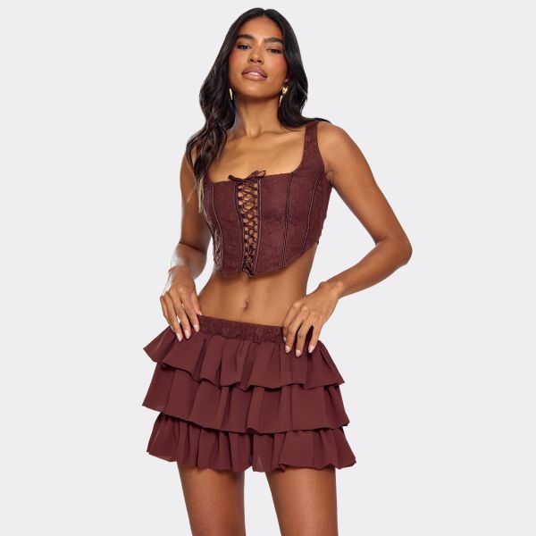 Dial up the edge with this chocolate brown lace up corset top, designed with a square neckline and lace-up front for ultimate impact. The structured boning and soft lace fabric of this corset top make it a standout choice for concert outfits or concert outfit ideas. Light, supportive and totally striking, this top is ready when you are - whether it's festival and gig.