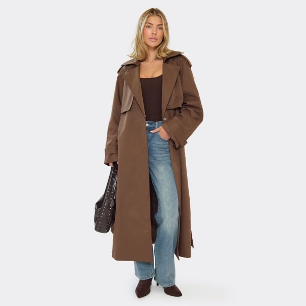 The EGO Tie Waist Maxi Trench Coat in Brown is ideal for work, casual, city walks.