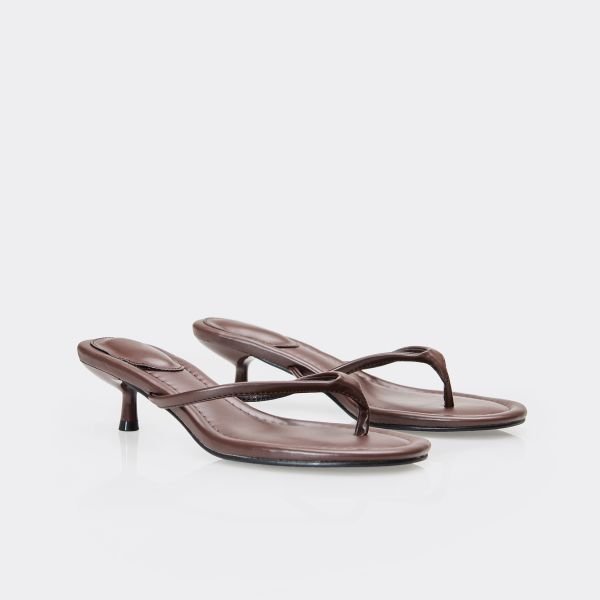 The EGO Brown Faux Leather Thong Strap Kitten Heel Mules is available in sizes 3, 4, 5, 6, 7, 8.