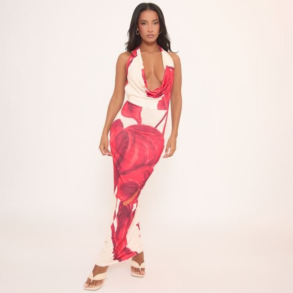 The EGO Cowl Halterneck Maxi Dress with Floral Print in Cream is ideal for beach, party, casual.