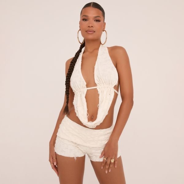 Introducing the perfect, flirty neutral top ready to be shown off this season. Featuring a cream textured material, an extreme cowl neck, and a distressed detail. Ideal for casual outings.