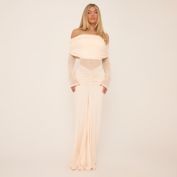 Keep it effortlessly elegant in our cream bardot maxi dress featuring a flattering fold-over neckline, with mesh panel details and a sleek, figure-hugging slinky fabric. Style this maxi dress with heels and sparkly earrings for a jaw-dropping look!