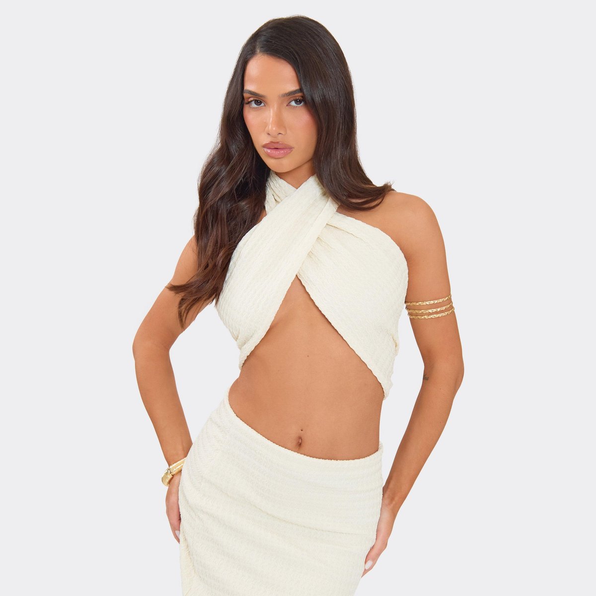 Refresh your summer wardrobe with this halterneck crop top, doll. Featuring a crisp cream textured fabric with sophisticated wrap-around detailing and a sharp, body-hugging fit, it brings a clean, artisanal edge to your look. Style with the matching textured mini shorts and gold bangles for a clean-chic aesthetic.