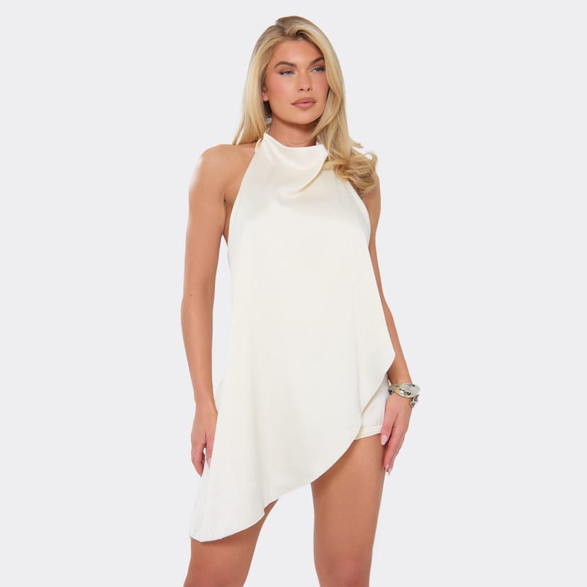 Elegant cream satin playsuit with a high neck and asymmetric drape detailing. This sharp, edgy piece offers a clean-girl aesthetic, perfect for a polished look. Ideal for evening events or date nights.