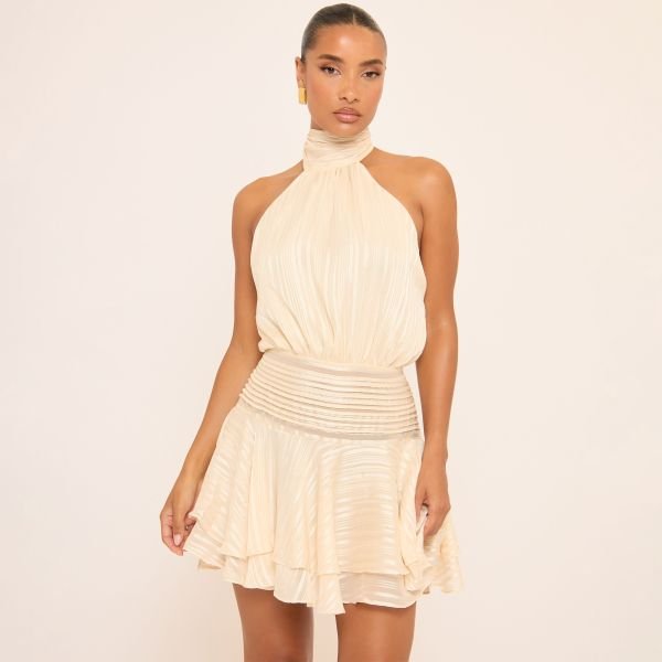 Go elegant in our cream high neck mini dress with a layered frill hem and open back, creating a delicate and sophisticated silhouette. Style this mini dress with nude heels and minimal jewelry for elevated glam.