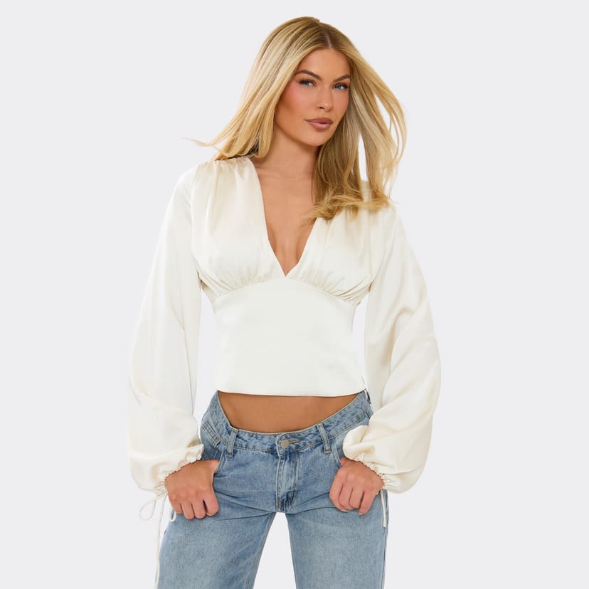 View EGO (UK)'s returns policyElegant cream satin top featuring balloon sleeves and a plunge front. Ideal for a night out with friends, pair with straight-leg jeans and heels for a chic look.
