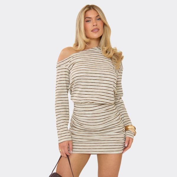 The EGO Cream Stripe Long Sleeve Asymmetric Mini Dress is ideal for evening, party, date-night.