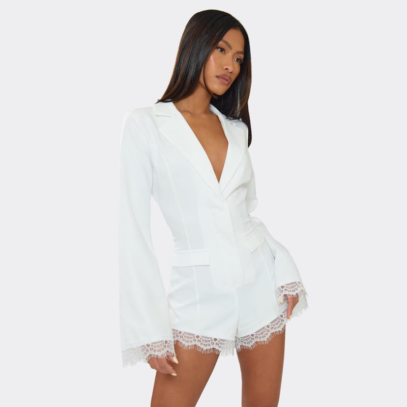 Elegant cream lace trim blazer playsuit with a long sleeve blazer fit. Perfect for summer events, featuring delicate lace detailing and a flattering silhouette.