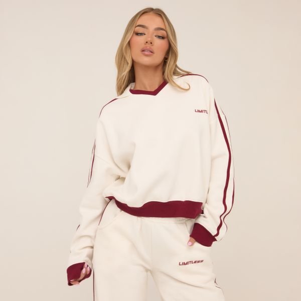 The EGO Contrast Burgundy Collar Oversized Jumper in Cream is ideal for lounge, casual.