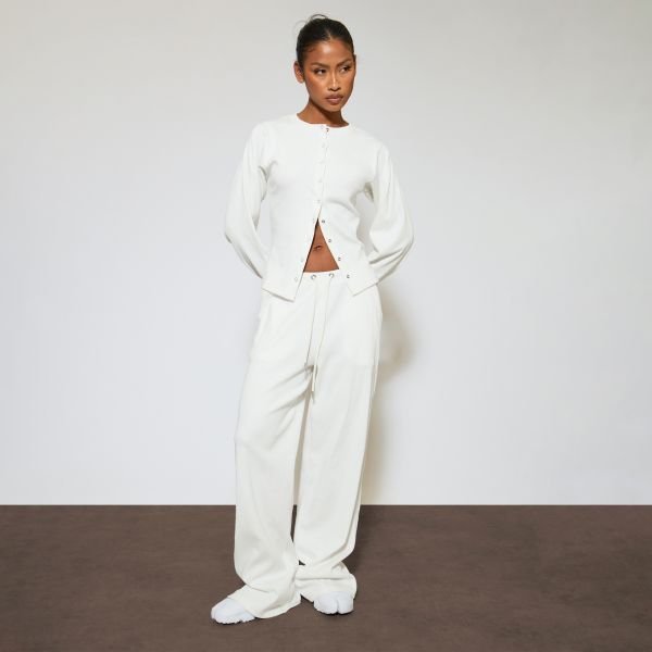 Nail the ultimate clean-girl aesthetic for your next chilled lounge day. Featuring cream ribbed material with low rise drawstring and wide leg detailing, these essential joggers are a total must-have for a relaxed but snatched silhouette.