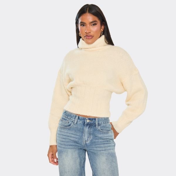 Designed for a casual-cool vibe, this jumper boasts cream knit material with a cinched waist and a roll neck fit. Effortlessly stylish, it complements wide-leg trousers and trainers for a trendy look.