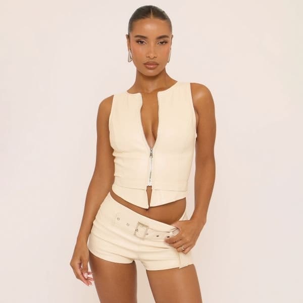 The EGO Sleeveless Zip Front Top in Cream Faux Leather is ideal for casual, smart-casual.