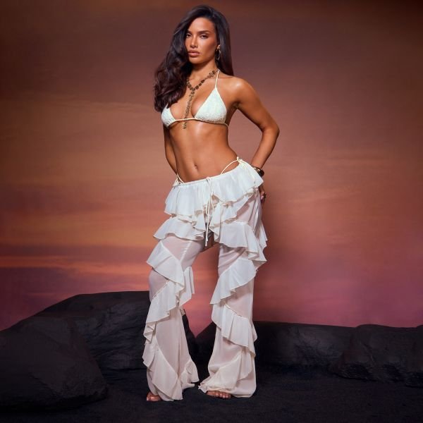 Designed with cream, these tie waist frilled detail trousers are a perfect blend of elegance and comfort. Featuring a high waist and frilled detailing, they offer a flattering fit for any occasion.