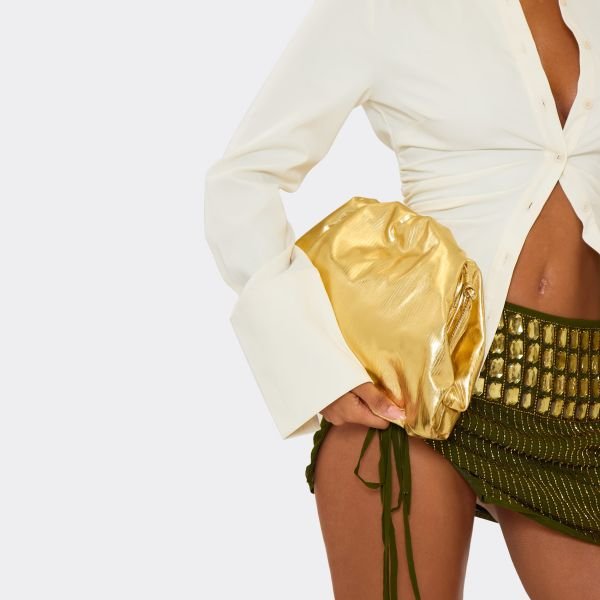 Step into night-out glam with the gold faux leather Grilled clutch bag. Its sleek design adds it-girl energy. Style with a bodycon dress and heels for boss-babe vibes.