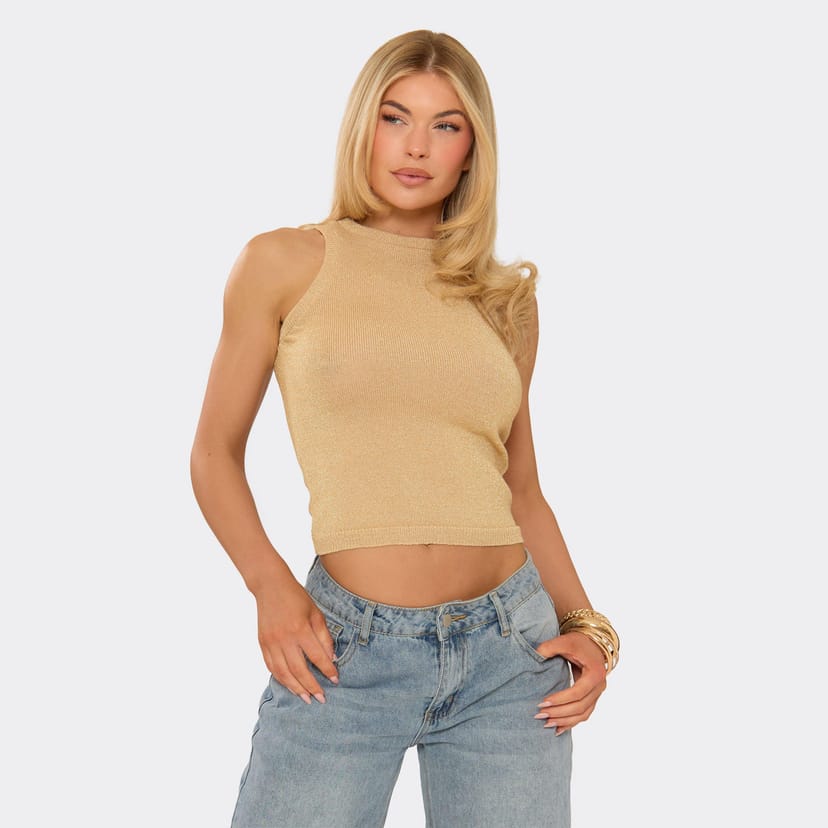 See all outfit ideasElegant gold glitter sleeveless racer vest top with a high neck and racer detailing. Perfect for party season and trendy looks. Pair with a mini skirt and killer heels for a standout ensemble.