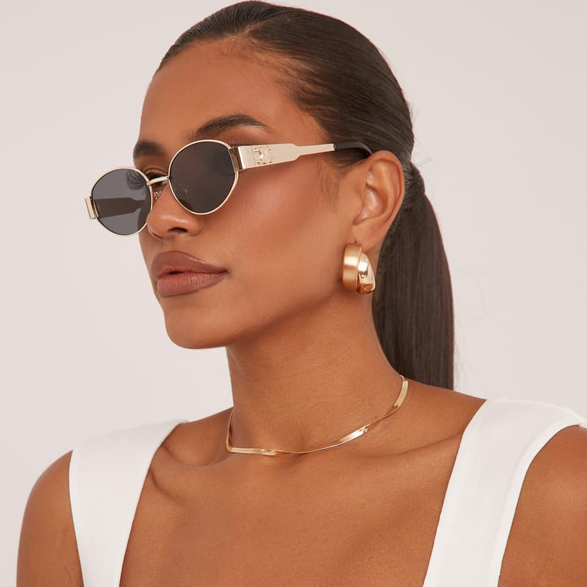 View EGO (UK)'s returns policyThese retro glam oval cateye shape sunglasses feature a gold metal frame with sleek side detailing for a luxe finish. Perfect for adding a touch of glamour to any outfit.