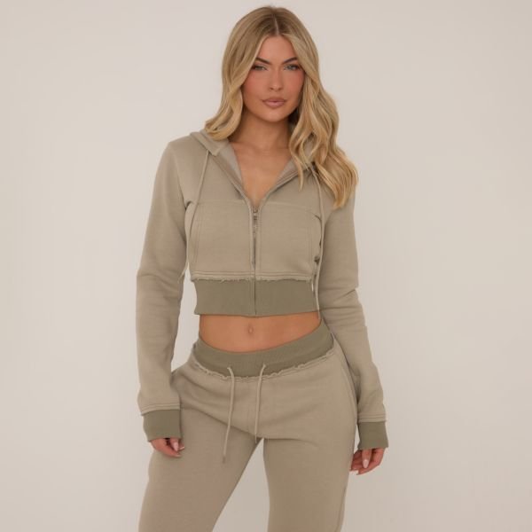 The EGO Contrast Distressed Detail Cropped Zip Up Hoodie in Green is ideal for casual, lounge.