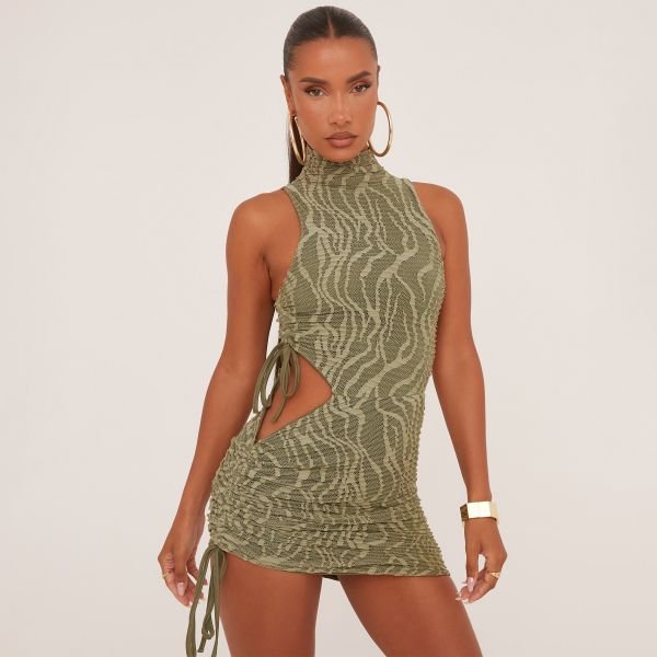 Designed to turn heads this summer, this dress features an olive green zebra print material, a high neck, a cut-out side detail, and a mini length.