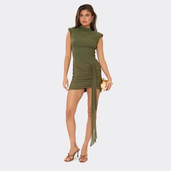 The EGO High Neck Drape Detail Mini Dress in Khaki is ideal for date-night, evening, dinners.