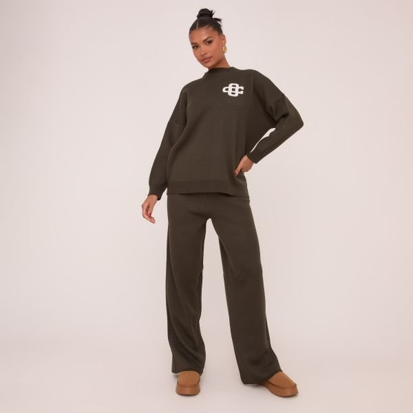The EGO High Waist Wide Leg Joggers in Dark Khaki Knit is available in sizes L, S.