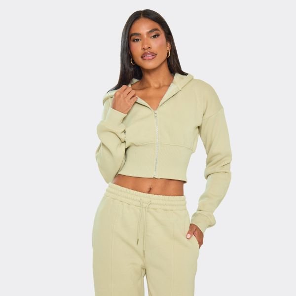 Designed with a sage green long sleeve, cinched waist, and zip up hoodie detailing, this piece is perfect for cosy-chic vibes, doll.