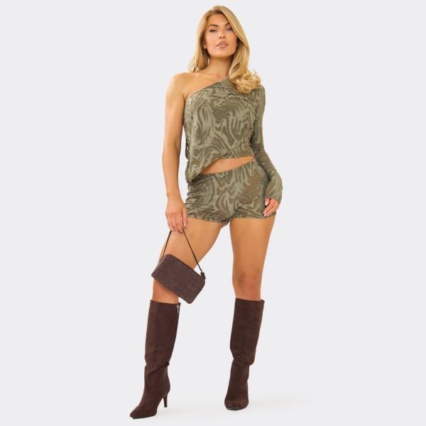 Festival-ready or street-style chic, these shorts feature khaki textured material with low-rise detailing and a fitted cut for a sleek edge. Perfect for a cool vibe.