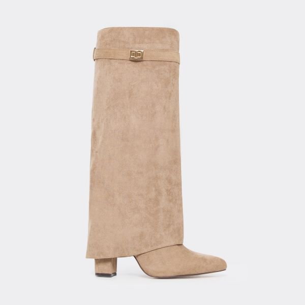 Serve polished-chic vibes, doll! Crafted in beige faux suede, these knee-high boots feature a pointed toe, block heel, and layered lock detailing, giving your look a bold, statement-ready finish.
