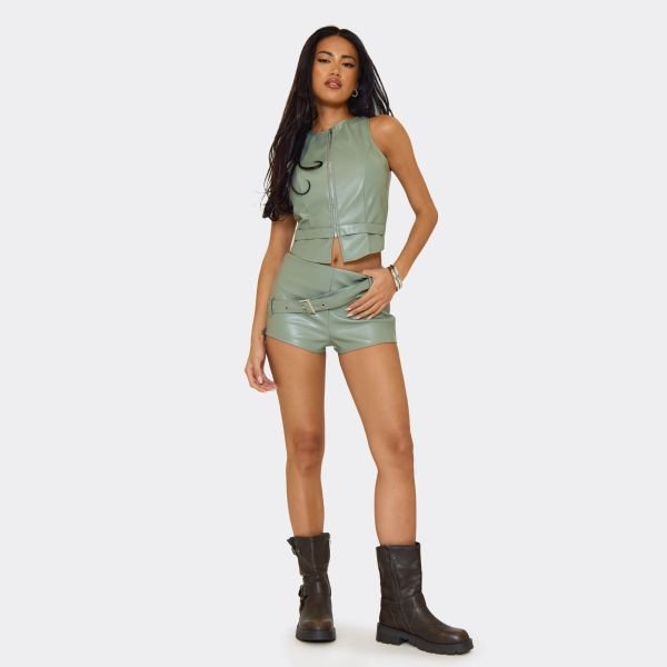 The EGO Mid Rise Belt Detail Shorts in Sage Green Faux Leather is ideal for casual, smart-casual.