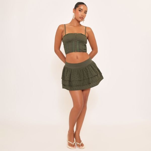 The EGO Frill Hem Detail Mini Skirt in Khaki Green Broderie is ideal for casual.