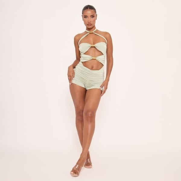 The EGO Ruched Detail Mid Rise Hot Pants in Green is ideal for festival, party, dancefloor.