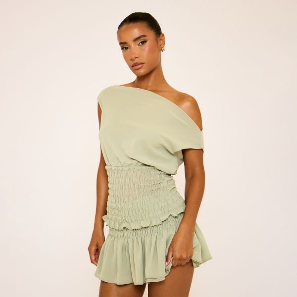 Designed with khaki green fabric, off-the-shoulder silhouette, and shirred waist detailing, this asymmetric top offers a chic, laid-back energy with bold attitude.