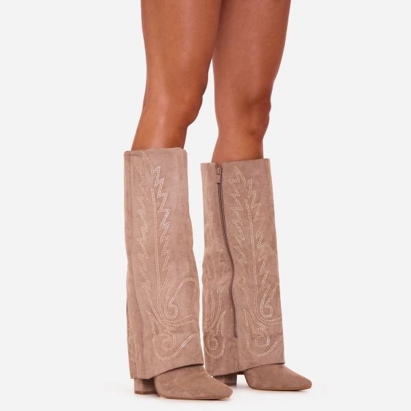 Demand attention in these layered knee high boots. Crafted in a rustic taupe faux suede, these knee-high boots bring classic western vibes whilst the diamante embroidered design gives that extra dash of drama. The sleek pointed toe and layered design make these cowboy boots perfect for day or night dressing.