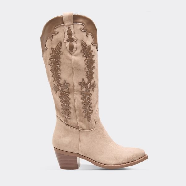 The EGO Beige Faux Suede Western Cowboy Boot is available in sizes 3, 4, 5, 6, 7, 8.