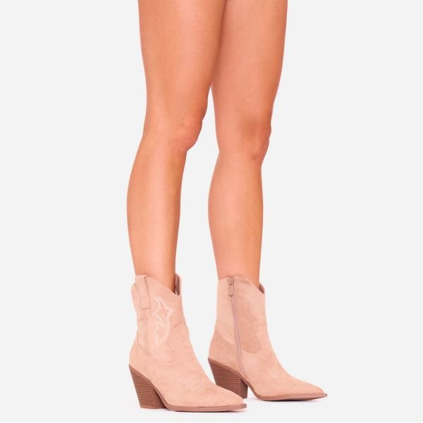 The EGO Cowboy Ankle Boots with Block Heel in Beige is available in sizes 3, 4, 5, 6, 7, 8.