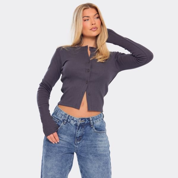 Designed with charcoal grey, soft ribbed fabric, crew neckline, and long sleeves, this top is perfect for autumn. The button-down front and cropped fit add a touch of effortless chic, making it ideal for transitioning from office to drinks.