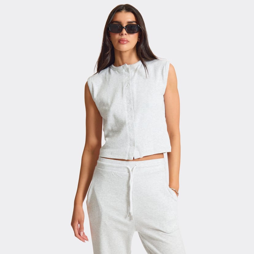 This light grey marl ribbed sleeveless top features a button-up front and a crop top design. Ideal for a casual look, pair it with your favourite baggy jeans and fresh trainers.