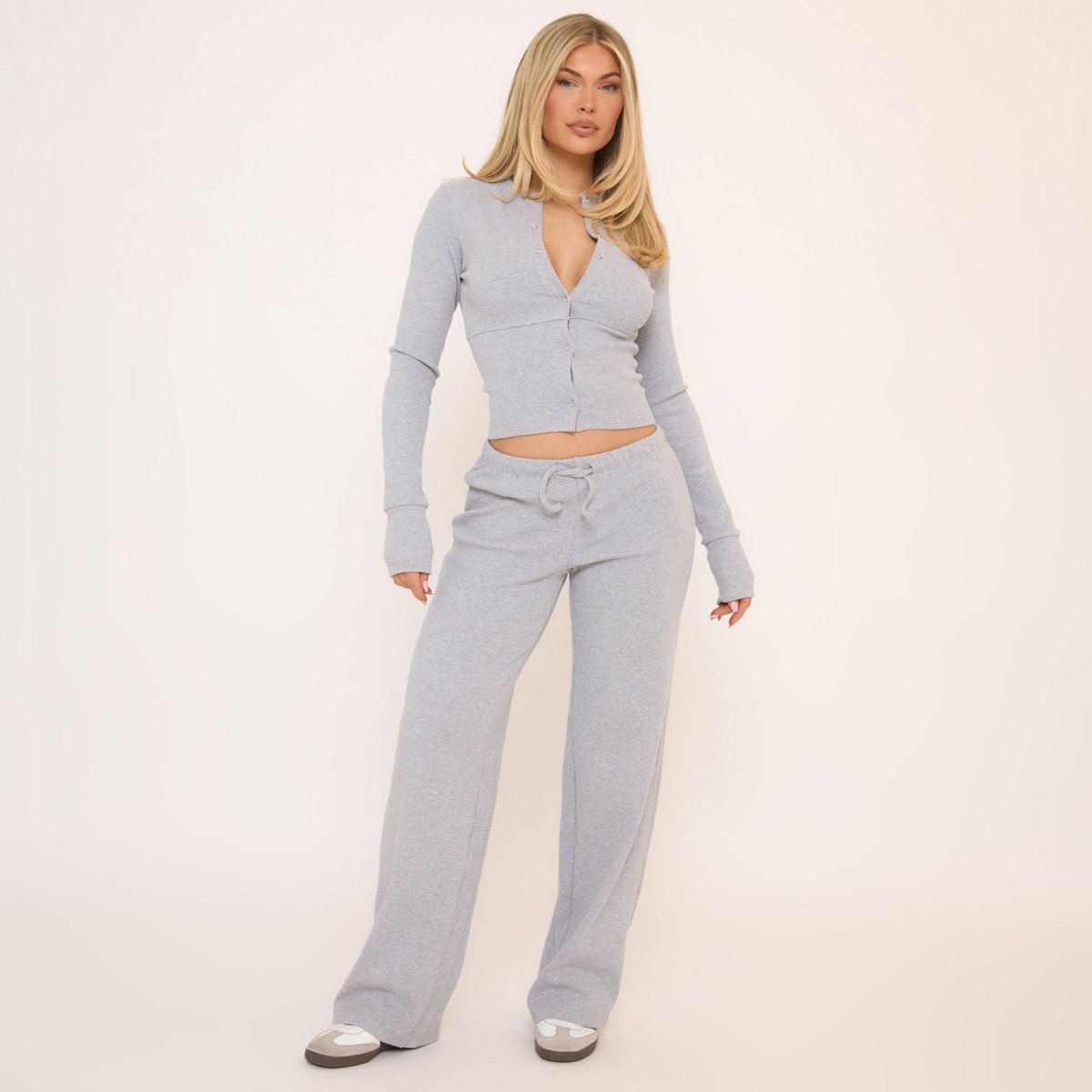 Effortlessly master the art of cozy-cool with these essential bottoms, doll. Featuring a light grey ribbed material with a sharp, straight-leg fit and a drawstring waist for that ultimate chilled-yet-polished silhouette, they bring a fresh, it-girl edge to your look.