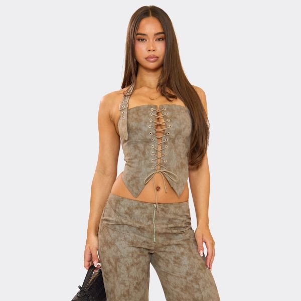 The EGO Halterneck Lace Up Front Top in Grey Acid Print is ideal for casual, nights out, day drink plans.