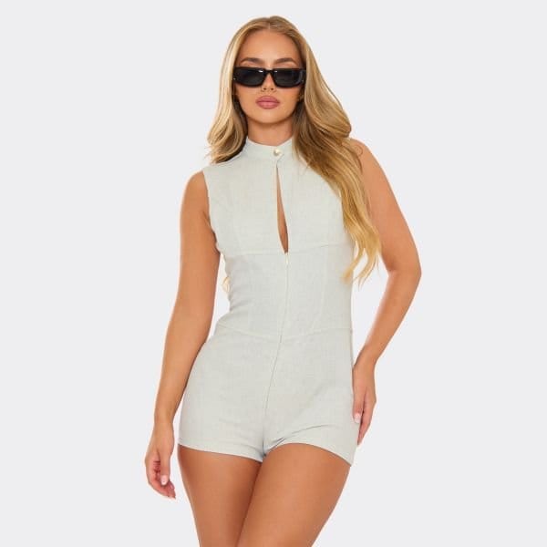The EGO High Neck Zip Front Keyhole Detail Playsuit in Grey is ideal for casual, party, date-night.